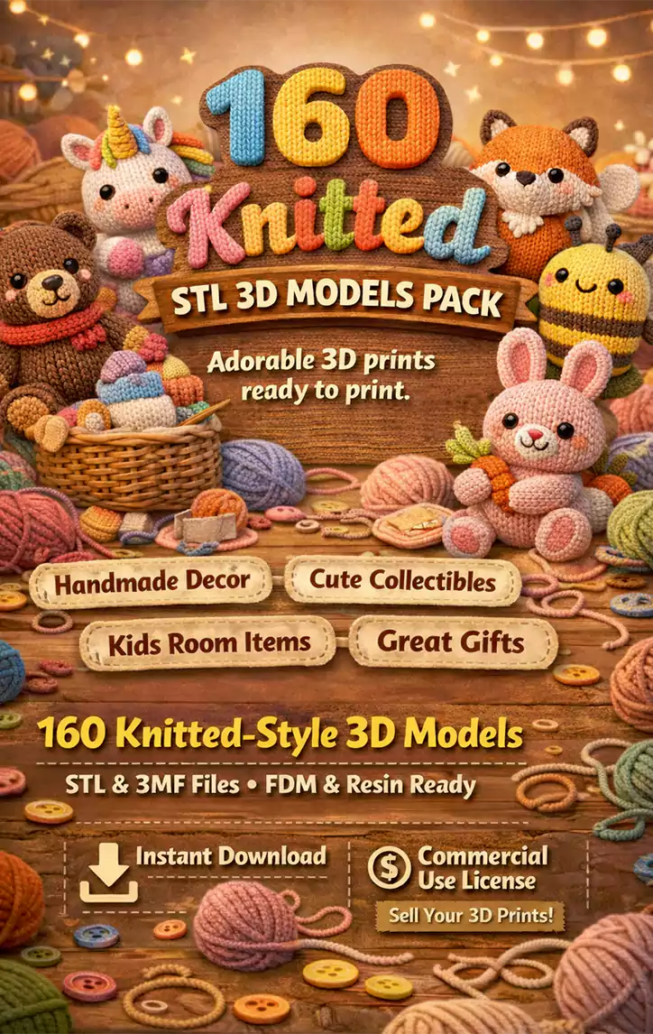 Bring warmth, charm, and creativity to your 3D prints with this 160 Knitted STL 3D Models Pack, a premium collection of beautifully crafted amigurumi-style 3D models designed to look like real knitted toys.